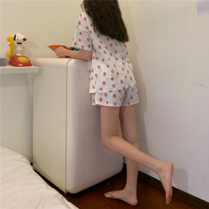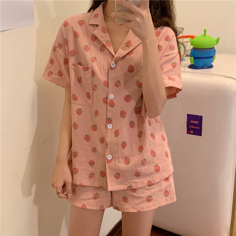 ルームウェア パジャマ 2色展開 寝巻き ナイトウェア ミニ ミニ丈 ショート ショート丈 袖あり 半袖 Vネック 襟付き ポケット 上下セット 2点セット ツーピース かわいい 大人可愛い おしゃれ お洒落 ラブリー キュート ガーリー いちご柄 いちご柄柄 苺柄 春 夏 秋 10代 20代 レディース ママ マタニティ お泊まり 休日 旅行 韓国 オルチャン フリーサイズ ワンサイズ ホ 1368