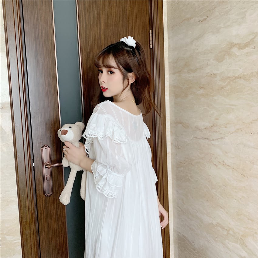 ルームウェア パジャマ ワンピース 半袖 五分袖 5分袖 ひざ下 膝下 ミドル丈 レース リボン シフォン ティアード 可愛い 大人可愛い シンプル カジュアル 上品 おしゃれ お洒落 ラブリー キュート ガーリー 無地 ホワイト 春 夏 秋 10代 20代 レディース ママ マタニティ お泊まり 休日 旅行 韓国 オルチャン フリーサイズ ワンサイズ ホ 5369