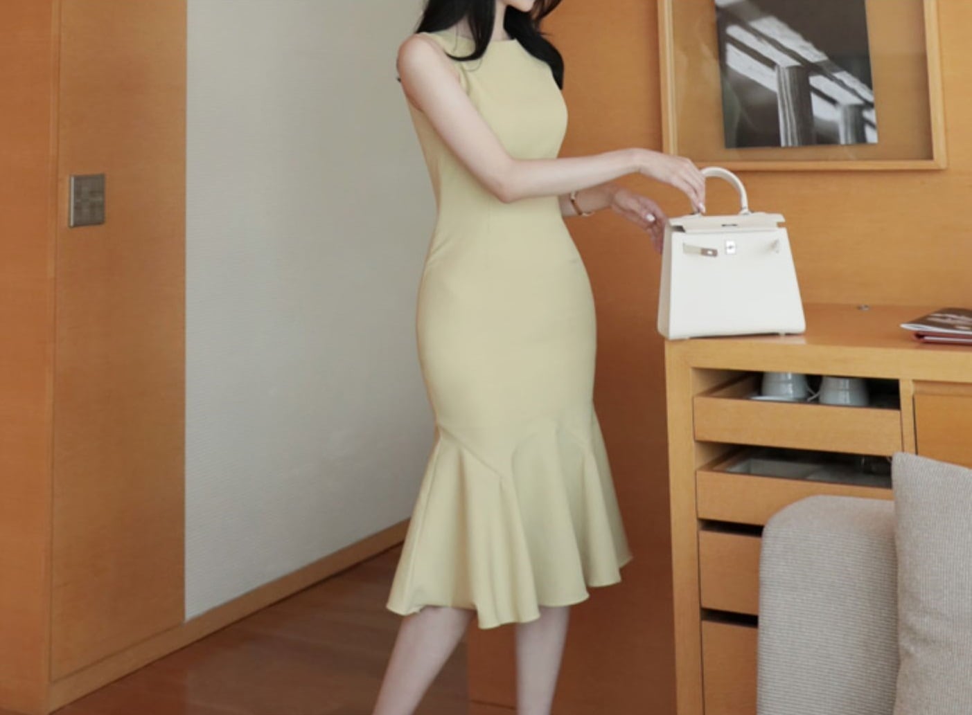 裾フレアのマーメイドシルエットで大人上品に仕上がった1枚です?