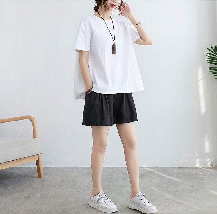 Tシャツ 半袖 袖あり コットン 綿 シンプル 無地 ラウンドネック 短丈 ショート丈 ショート イレギュラー アシメ アシンメトリー 背面デザイン 切り替え ギャザー ゆったり ゆる 大きめ ルーズ 体型カバー おしゃれ お洒落 通勤 通学 お出かけ デート 旅行 休日 普段着 普段使い 着回し 部屋着 スポーツ 運動 レディース 夏 大きいサイズ L XL 2XL ホワイト 白 5670