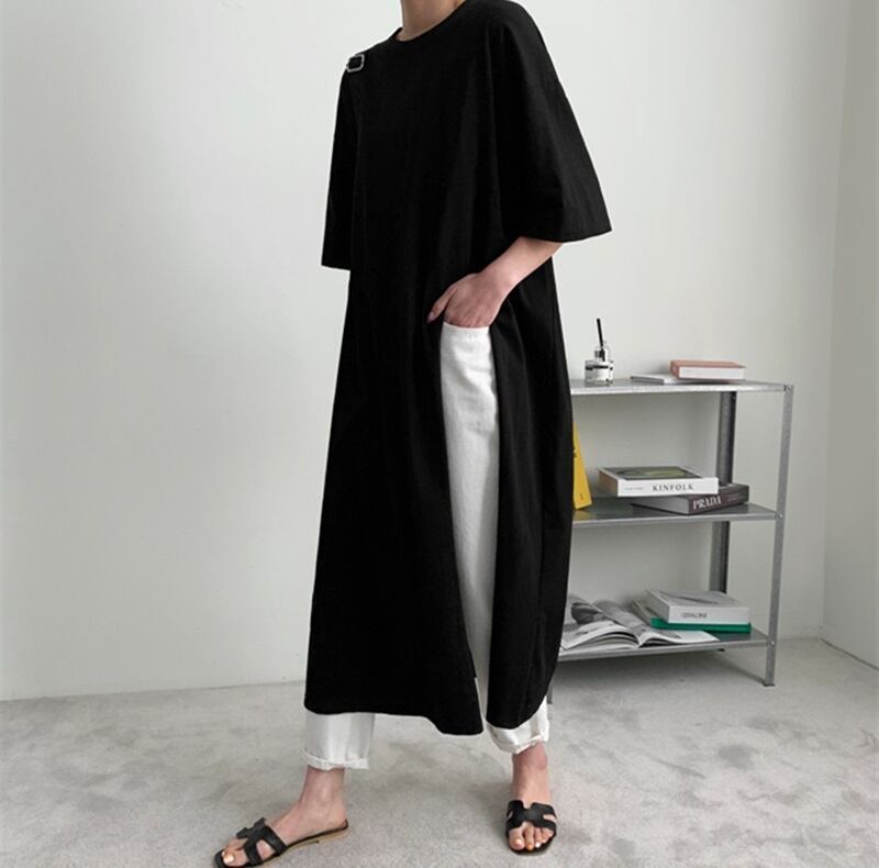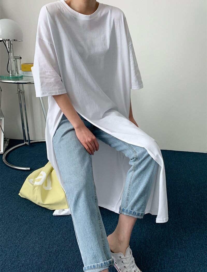 ロング丈 Tシャツ 半袖 袖あり ロングTシャツ トップス ワンピース シンプル 無地 ロング スリット ラウンドネック コットン 綿 薄手 ゆったり ゆる ルーズ 大きめ 体型カバー ママ 公園デビュー お洒落 お洒落 カジュアル 通勤 通学 学生 お出かけ デート 旅行 休日 普段着 普段使い 着回し レディース 10代 20代 30代 夏 S M L XL ホワイト 白 5671