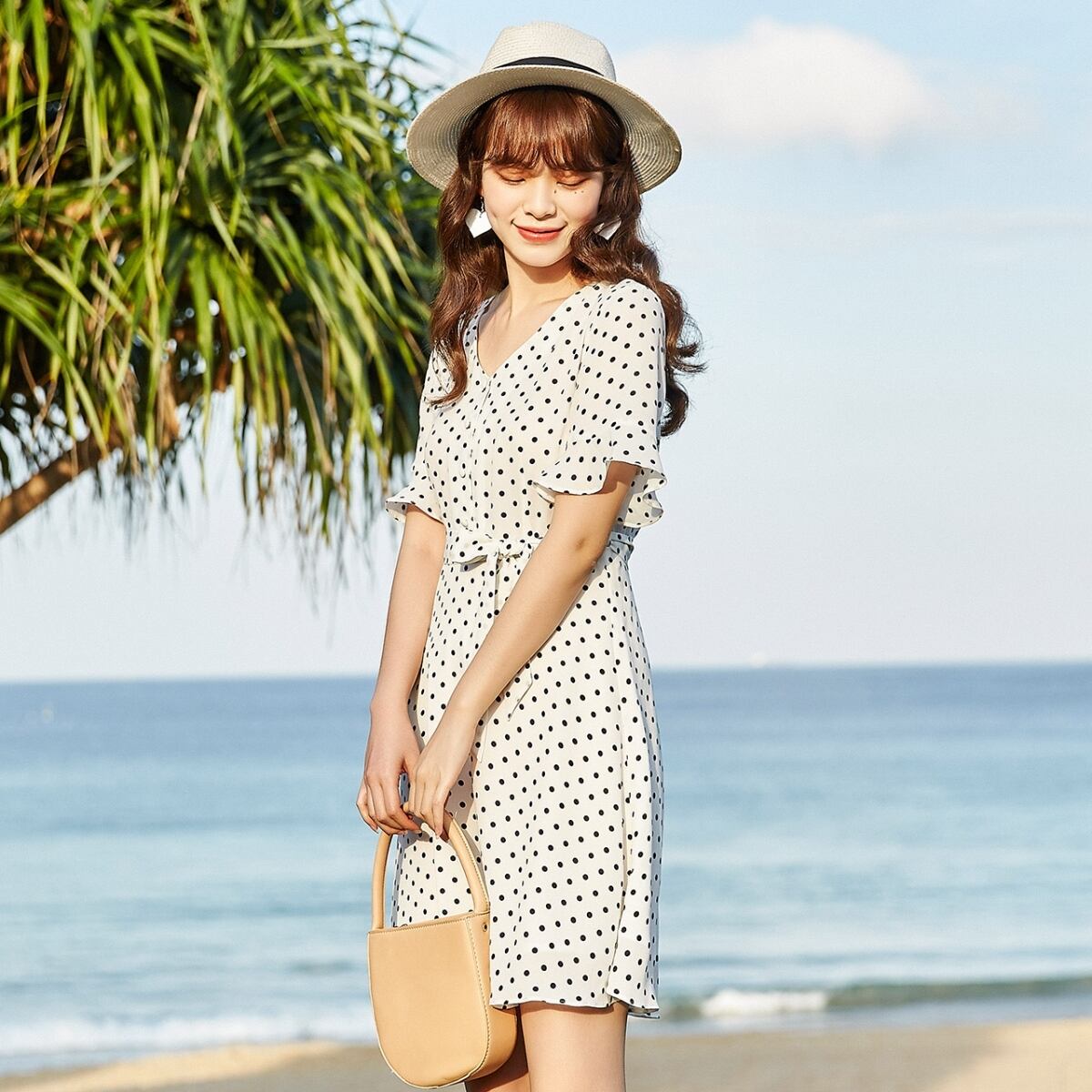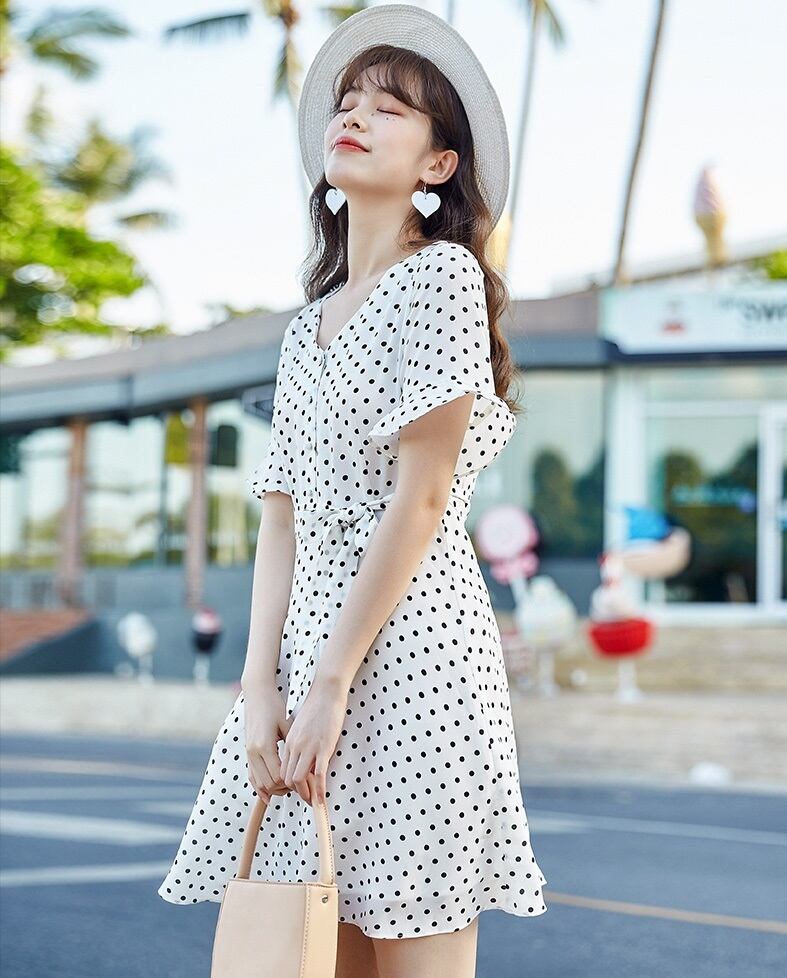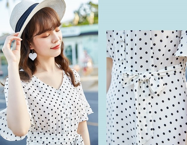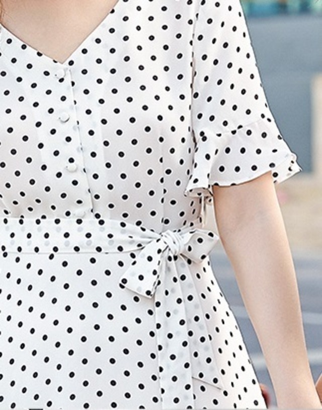 ワンピース シフォン 半袖 袖あり Vネック ドット柄 水玉 Aライン 膝上 ひざ上 ミニ丈 ミニ フレア袖 フレアスリーブ フリル フレア ハイウエスト 切り替え ウエストリボン 腰紐 リボン結び フロントボタン ガーリー フェミニン 大人可愛い かわいい 可愛い 大人女子 女の子 おしゃれ お洒落 通勤 通学 学生 お出かけ デート 旅行 休日 普段着 普段使い 海 ビーチ リゾート レディース 10代 20代 夏 S M L 5696