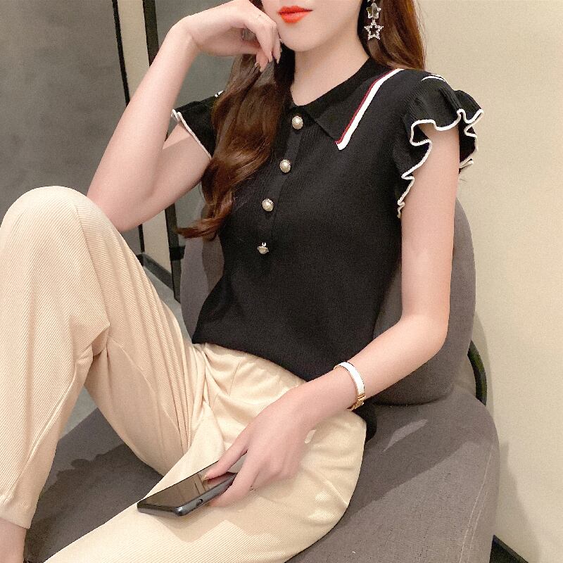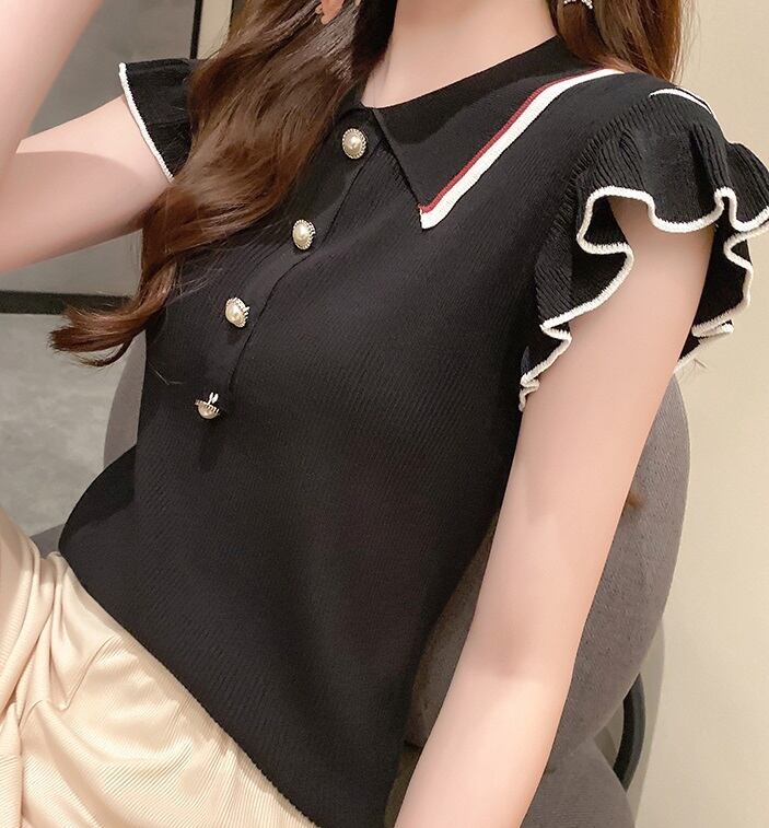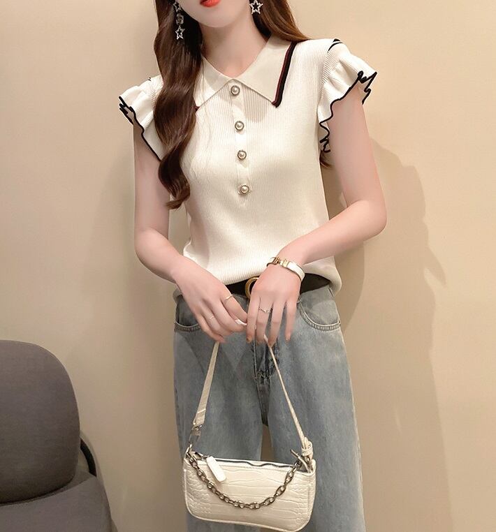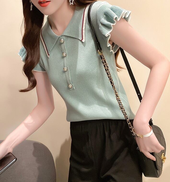 トップス シルク ニット セーター サマーニット 半袖 袖あり フレンチスリーブ フリル 襟付き ポロ襟 フロントボタン パール ボタン スリム 細身 バイカラー 配色 トリム 主役級 ガーリー ラブリー 大人可愛い かわいい 可愛い 大人女子 おしゃれ お洒落 通勤 通学 学生 女の子 お出かけ デート 旅行 休日 普段着 普段使い 着回し レディース 10代 20代 夏 ワンサイズ ホワイト 白 グリーン 緑 5701