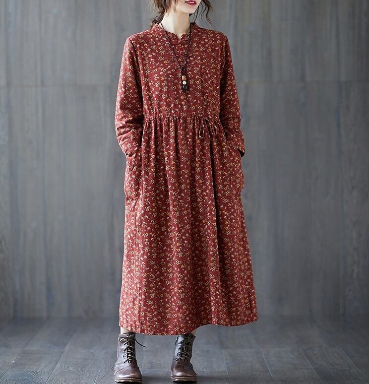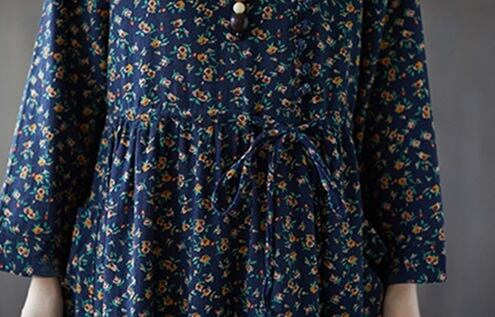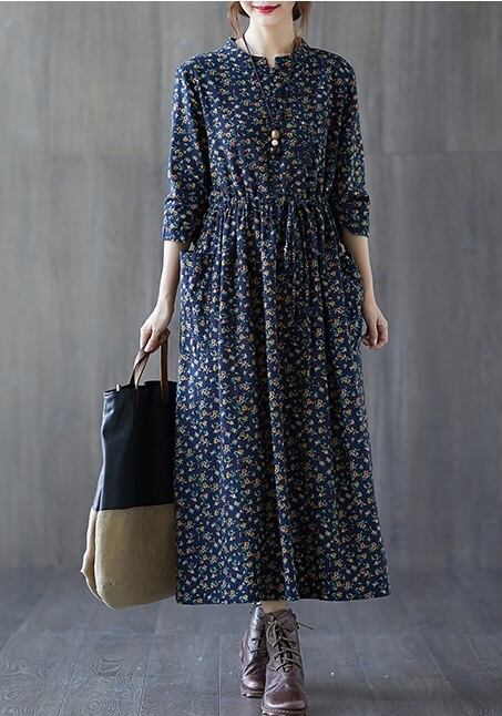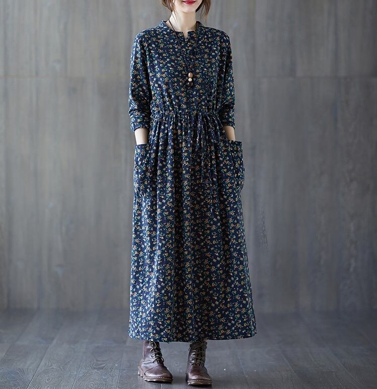 綿 麻 ワンピース コットン リネン 小花柄 総花柄 フローラル 長袖 袖あり 襟なし ハイウエスト 切り替え ロング丈 ロング ミモレ丈 膝下 ひざ下 ポケット付き 大人 カジュアル 大人可愛い かわいい 可愛い 大人女子 おしゃれ お洒落 通勤 通学 お出かけ デート 旅行 休日 普段着 普段使い 20代 30代 レディース 春 秋 大きいサイズ M L XL 2XL ネイビー 紺 ブリ 5716