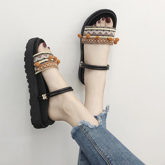 エスニック柄にぽんぽんが可愛いフラットサンダル♪
