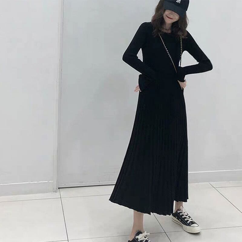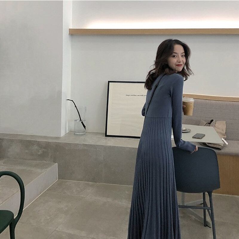 ニット ワンピース 長袖 半袖 2タイプ 袖あり プリーツ ハイウエスト 切り替え ラウンドネック シンプル 無地 ロング ロング丈 ミモレ丈 伸縮性 スリム 細身 大人 カジュアル 大人可愛い かわいい 可愛い 大人女子 おしゃれ お洒落 通勤 通学 学生 お出かけ デート 旅行 休日 普段着 普段使い レディース 10代 20代 春 秋 S M L ブルー 青 5722