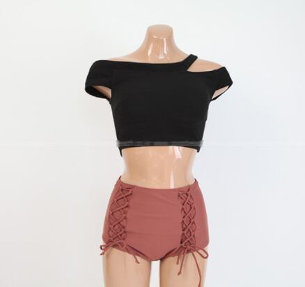 トップスのカットオフショルダー、ボトムスの編み上げが可愛いセパレート水着♪