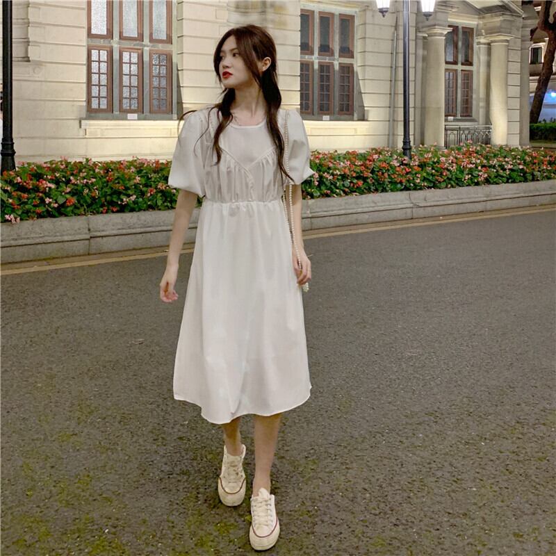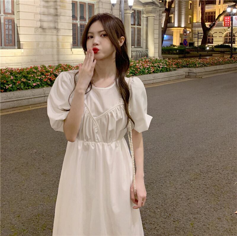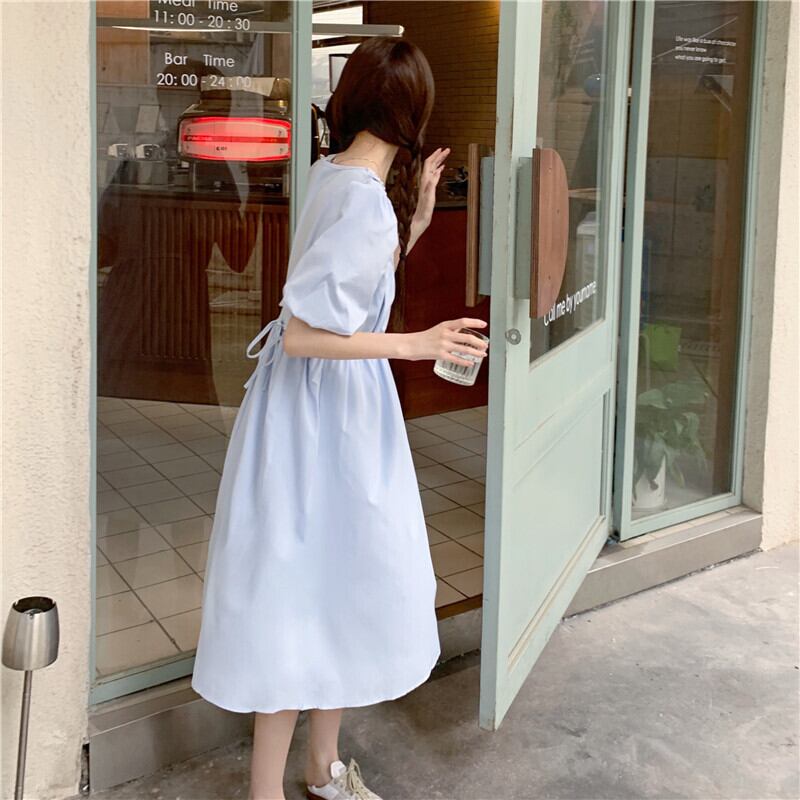 ワンピース レイヤード風 重ね着風 キャミソール バックリボン 半袖 袖あり ロング 膝下 ひざ下 ミディ丈 ラウンドネック 無地 シンプル パフスリーブ パフ袖 くしゅくしゅ ギャザー シャーリング ハイウエスト 切り替え 大人可愛い かわいい 可愛い 大人女子 おしゃれ お洒落 通勤 通学 学生 お出かけ デート 旅行 休日 普段着 普段使い レディース 10代 20代 夏 ワンサイズ ライトブルー 水色 5731
