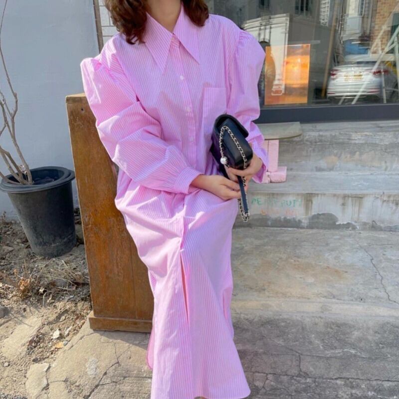 ストライプシャツワンピース ワンピース シャツワンピース ワンピドレス ロング ロング丈 マキシ マキシ丈 袖あり 長袖 パフスリーブ 襟付き スリット 前開き かわいい 大人可愛い きれいめ シンプル カジュアル 大人 おしゃれ お洒落 大人可愛い 大人女子 こなれ感 ストライプ 春 夏 秋 10代 20代 30代 レディース OL 通勤 学生 通学 デート お出かけ 女子会 休日 着回し 普段使い 重ね着 韓国 韓国系 青 5972