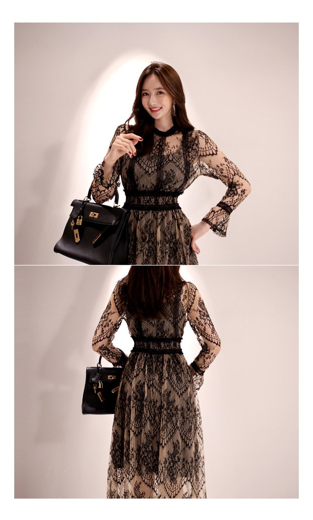 シースルーレースドレス ワンピース フレアワンピース ワンピドレス ミモレ ミモレ丈 ミディアム丈 袖あり 長袖 萌袖 ラウンドネック 切り替えデザイン レース ウエストマーク ハイウエスト ウエストゴム 透け感 シースルー かわいい 大人可愛い きれいめ シンプル 大人 上品 おしゃれ お洒落 大人可愛い 大人女子 こなれ感 ラブリー キュート ガーリー 主役級 存在感 柄 花柄 春 夏 秋 10代 20代 30代 レディース デート お出かけ 女子会 休日 パーティー サイズ S 6275