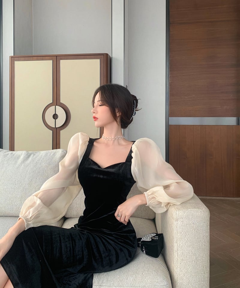 Ⅴネックパフスリーブワンピース ワンピース ロング ロング丈 袖あり 長袖 パフスリーブ Vネック スリム タイト 細身 Iライン シフォン かわいい 大人可愛い きれいめ シンプル 大人 上品 おしゃれ お洒落 大人可愛い 大人女子 こなれ感 セクシー エレガント 無地 春 夏 秋 10代 20代 30代 レディース デート お出かけ 女子会 お泊まり 休日 パーティー イベント 普段使い 重ね着 韓国 韓国系 サイズ S M 6282