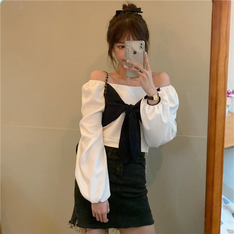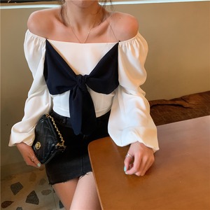 フロントリボンオフショルブラウス トップス ブラウス 袖あり 長袖 パフスリーブ スクエアネック オフショルダー オフショル リボン かわいい 大人可愛い きれいめ シンプル 大人 上品 おしゃれ お洒落 大人可愛い 大人女子 ラブリー キュート ガーリー 主役級 無地 春 夏 秋 10代 20代 30代 レディース 学生 通学 デート お出かけ 女子会 休日 着回し 普段使い 韓国 韓国系 色展開 白 ホワイト ネイビー 6290