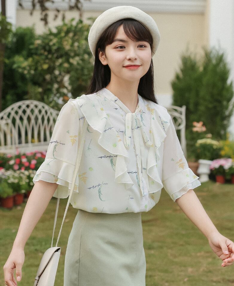フラワープリントフリルブラウス トップス ブラウス 袖あり 半袖 シフォン フリル リボン ポリエステル かわいい 大人可愛い シンプル カジュアル おしゃれ お洒落 ラブリー キュート ガーリー 個性的 主役級 柄 フラワー 春 夏 10代 20代 30代 レディース OL 通勤 学生 通学 デート お出かけ 女子会 休日 着回し 普段使い 重ね着 韓国 韓国系 サイズ S M L 色展開 6293