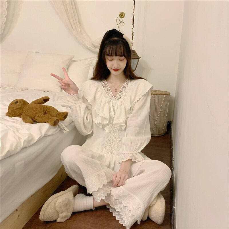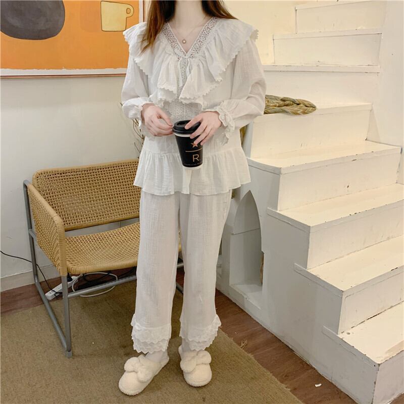ルームウェア パジャマ 上下セット トップス ボトムス パンツ ズボン 2点セット ツーピース Vネック フリル 襟付き ビッグカラー 大きめ襟 長袖 袖あり リボン 刺? レース フレア キャンディースリーブ コットン 綿 ゆったり ゆる ルーズ 大人可愛い かわいい 可愛い 主役級 存在感 ガーリー ラブリー キュート スウィート カジュアル 部屋着 寝巻き ナイトウェア お泊り デート 旅行 休日 レディース 10代 20代 春 秋 ワンサイズ ホワイト 6333