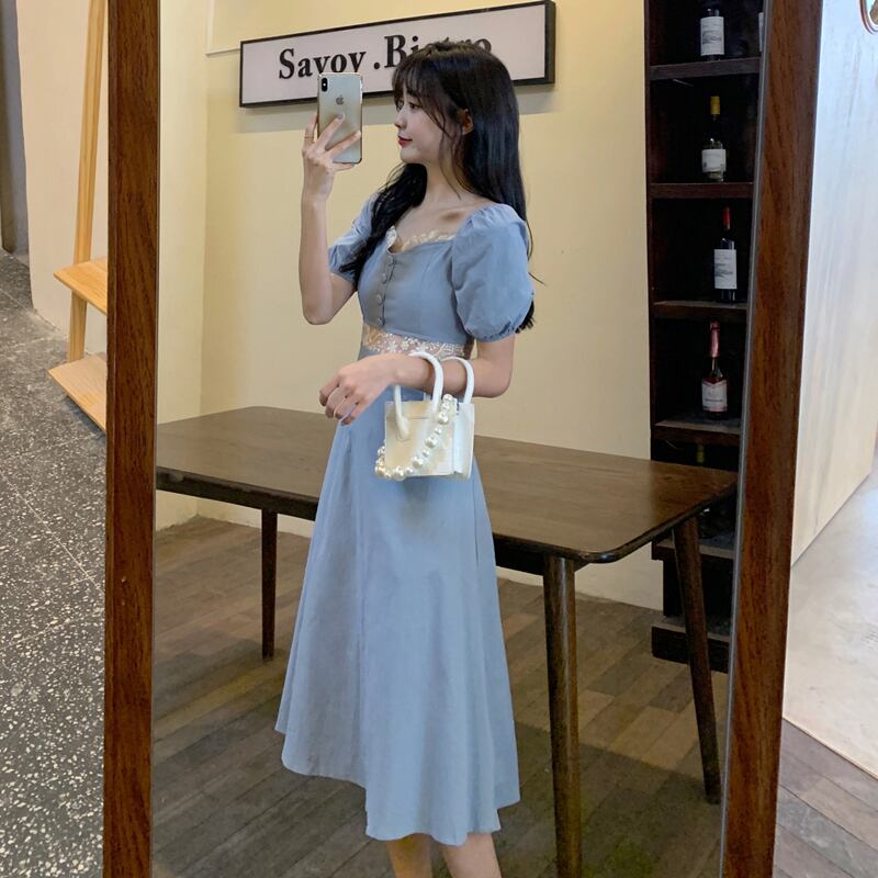 胸元とウエストのレースが可愛いパフスリーブワンピース♪