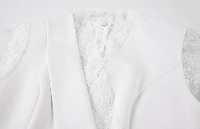 スーツのようなデザインと、襟元のレースがおしゃれな膝丈ドレス♪