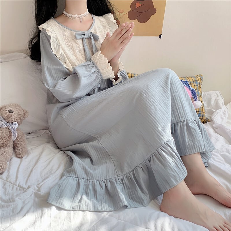 レースパジャマワンピース ルームウェア パジャマ 部屋着 寝巻き ナイトウェア ネグリジェ ミモレ ミモレ丈 ロング ロング丈 袖あり 長袖 スクエアネック レース フリル リボン 綿 かわいい 大人可愛い シンプル カジュアル おしゃれ お洒落 大人可愛い 大人女子 こなれ感 ラフ ラブリー キュート ガーリー 柄 春 夏 秋 10代 20代 30代 レディース 女子会 お泊まり 休日 着回し 普段使い 楽ちん 色展開 ブルー 6552