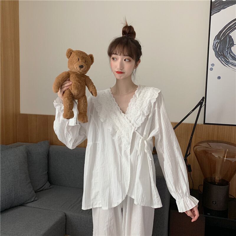 レディースパジャマ ルームウェア ナイトウェア Vネック 長袖 上下セット ツーピース セットアップ レース フリル リボン フレア 薄手 部屋着 寝間着 春 夏 大人可愛い 大人女子 ガーリー キュート ラブリー おうちコーデ おうち時間 リラックスウェア 旅行 海外旅行 お泊まり リゾート バカンス インスタ映え カラー ホワイト サイズ 6556