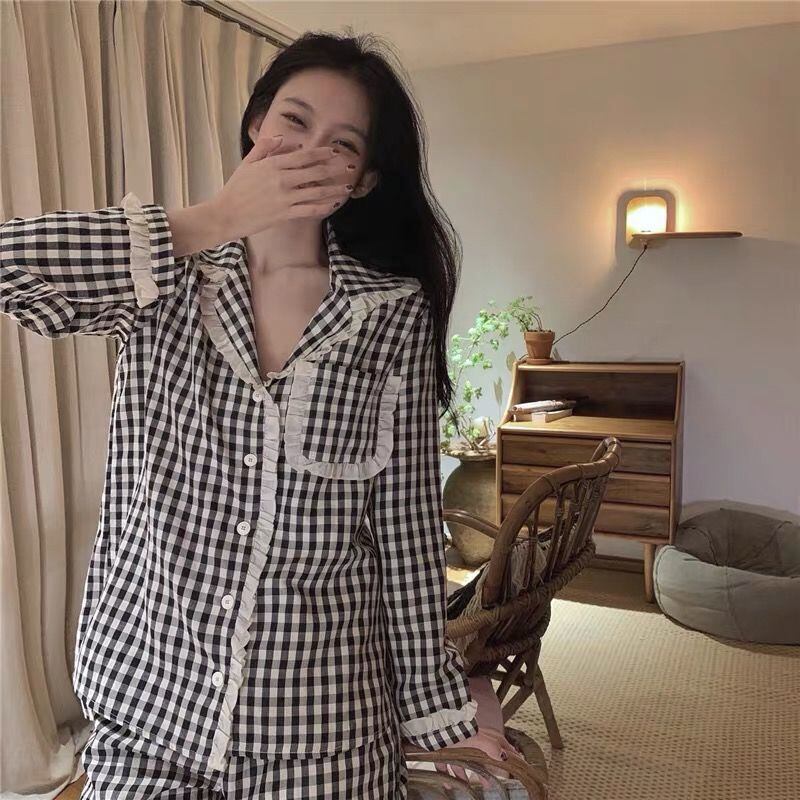 レディースパジャマ 長袖 開襟シャツ フリル 二点セット 上下セット セットアップ ツーピース ルームウェア ナイトウェア 部屋着 寝間着 春 秋 大人可愛い 大人女子 おうち時間 おうちコーデ 休日 リラックスウェア 旅行 お泊まり リゾート バカンス キュート ガーリー ラブリー モノトーン 色違い お揃い インスタ映え カラー チェック ブラック サイズ展開 M L 6582