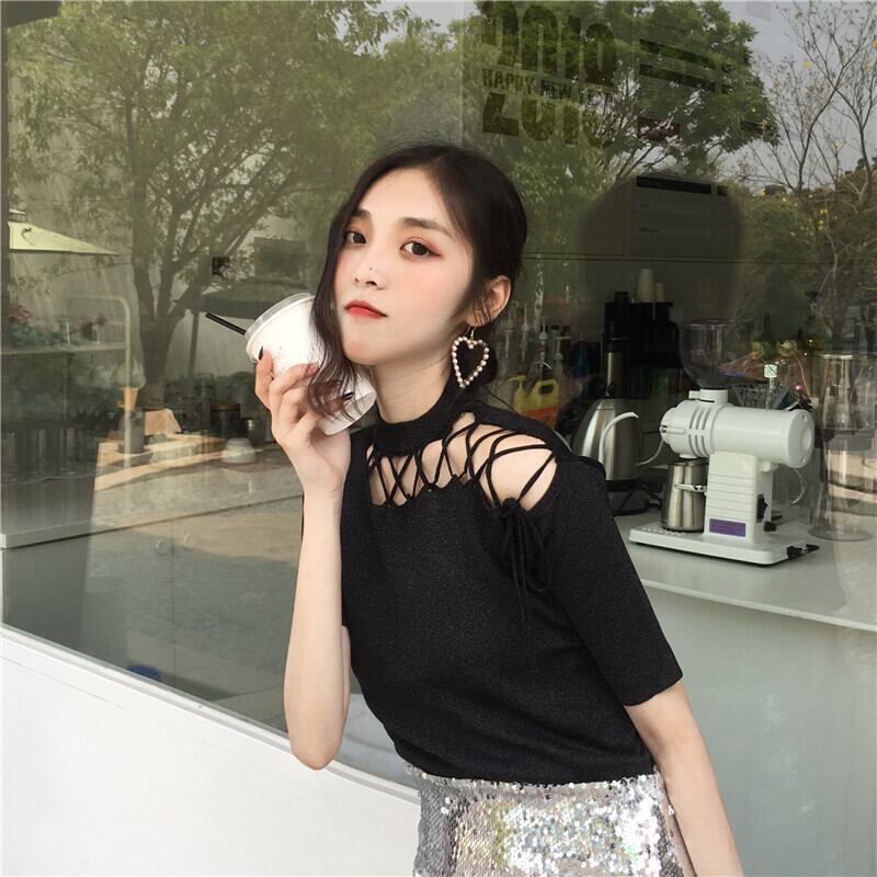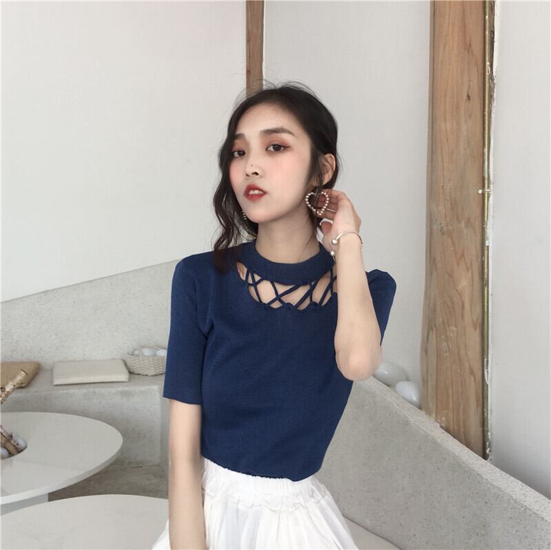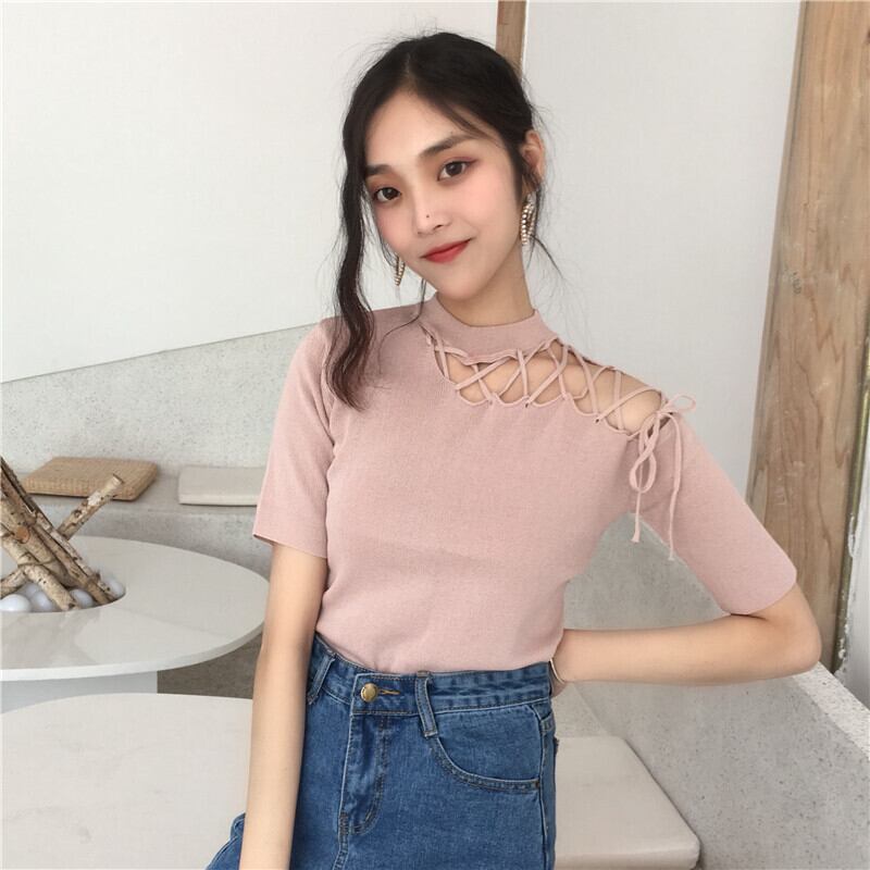 トップス 半袖 Tシャツ 袖あり レースアップ 穴あき 肌魅せ 肩見せ 肩出し 無地 イレギュラー アシメ デザイン ラウンドネック スリム 細身 個性的 大人可愛い かわいい 可愛い 大人女子 おしゃれ お洒落 通勤 通学 学生 お出かけ デート 旅行 休日 普段着 普段使い 着回し レディース 10代 20代 夏 ワンサイズ アプリコット ブルー 青 5775