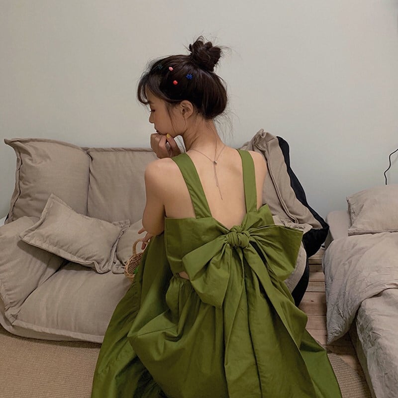 背中の開きや大きなリボンが、大人っぽくもありフェミニンさも漂うデザインです。