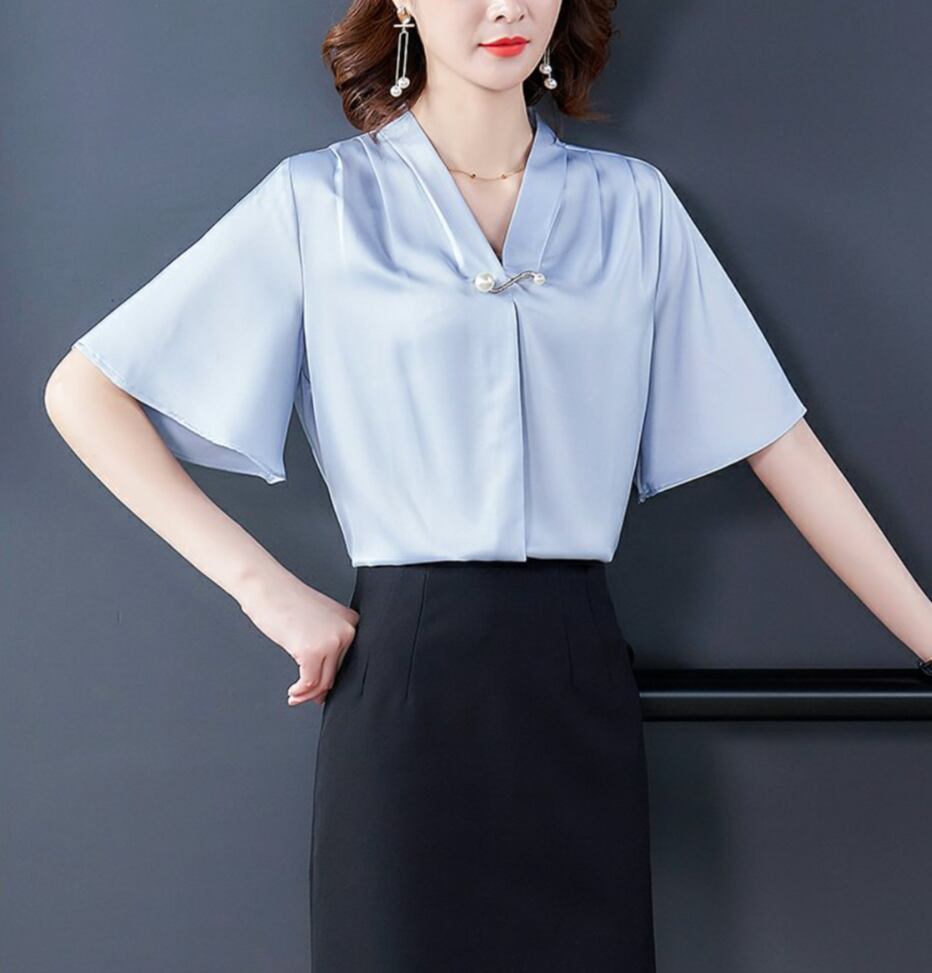 トップス シャツ ブラウス シルク シフォン 半袖 袖あり フレア袖 フレアスリーブ 薄手 薄い Vネック パール 装飾 ゆったり ルーズ シンプル 無地 大人 上品 エレガント きれいめ 大人可愛い かわいい 可愛い 大人女子 おしゃれ お洒落 通勤 OL オフィス お出かけ デート 旅行 休日 普段着 普段使い 着回し 食事会 レディース 20代 30代 夏 S M L XL ピンク ブルー 青 6731