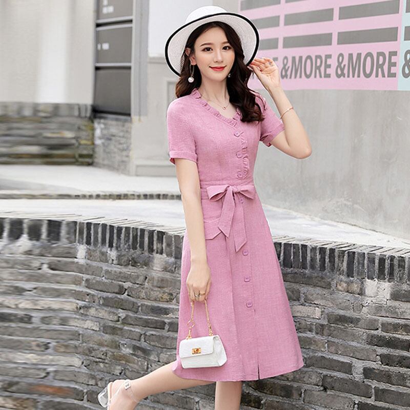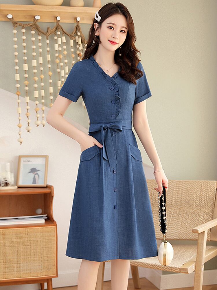 フロントボタンワンピース ワンピース フレアワンピース 膝丈 ひざ丈 袖あり 半袖 ラウンドネック スタンドカラー リボン ウエストマーク ウエストリボン 前開き 綿 麻 リネン かわいい 大人可愛い きれいめ シンプル カジュアル おしゃれ お洒落 大人可愛い 大人女子 こなれ感 ラフ ラブリー キュート ガーリー 主役級 無地 春 夏 10代 20代 30代 レディース 学生 通学 デート お出かけ 女子会 休日 着回し 普段使い サイズ M L 2XL 3XL 色展開 青 ブルー グ 6429
