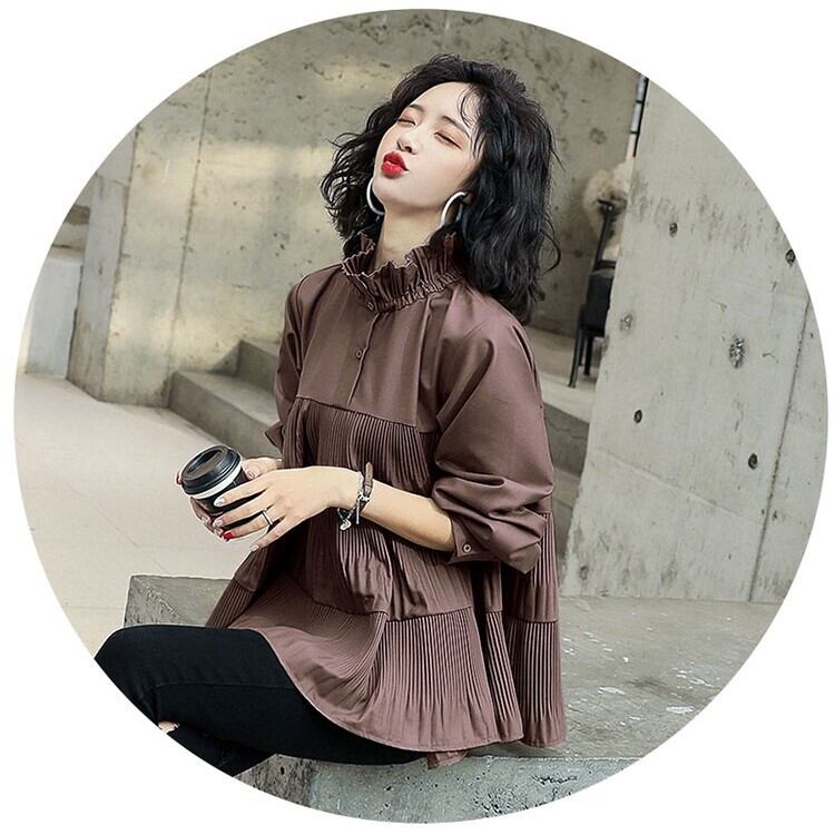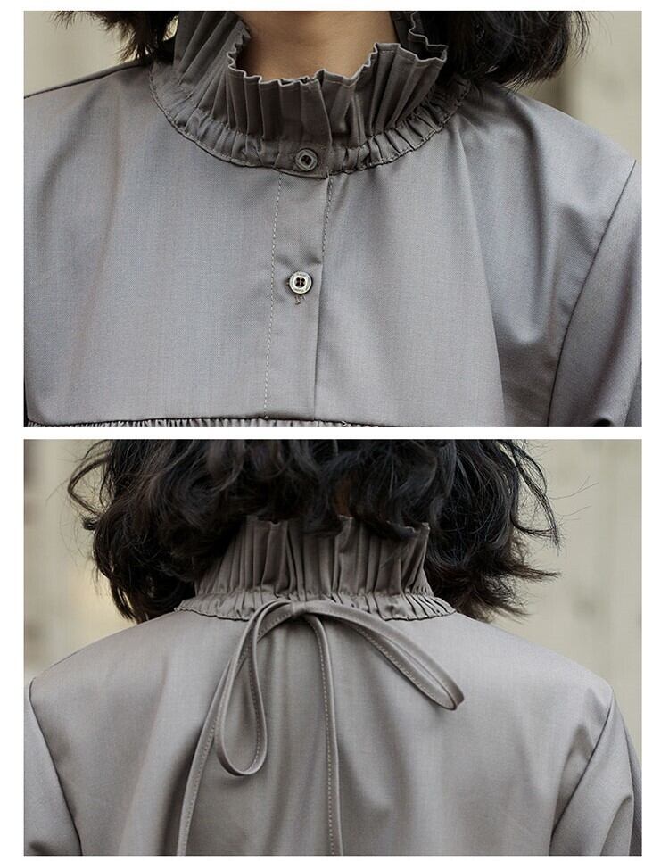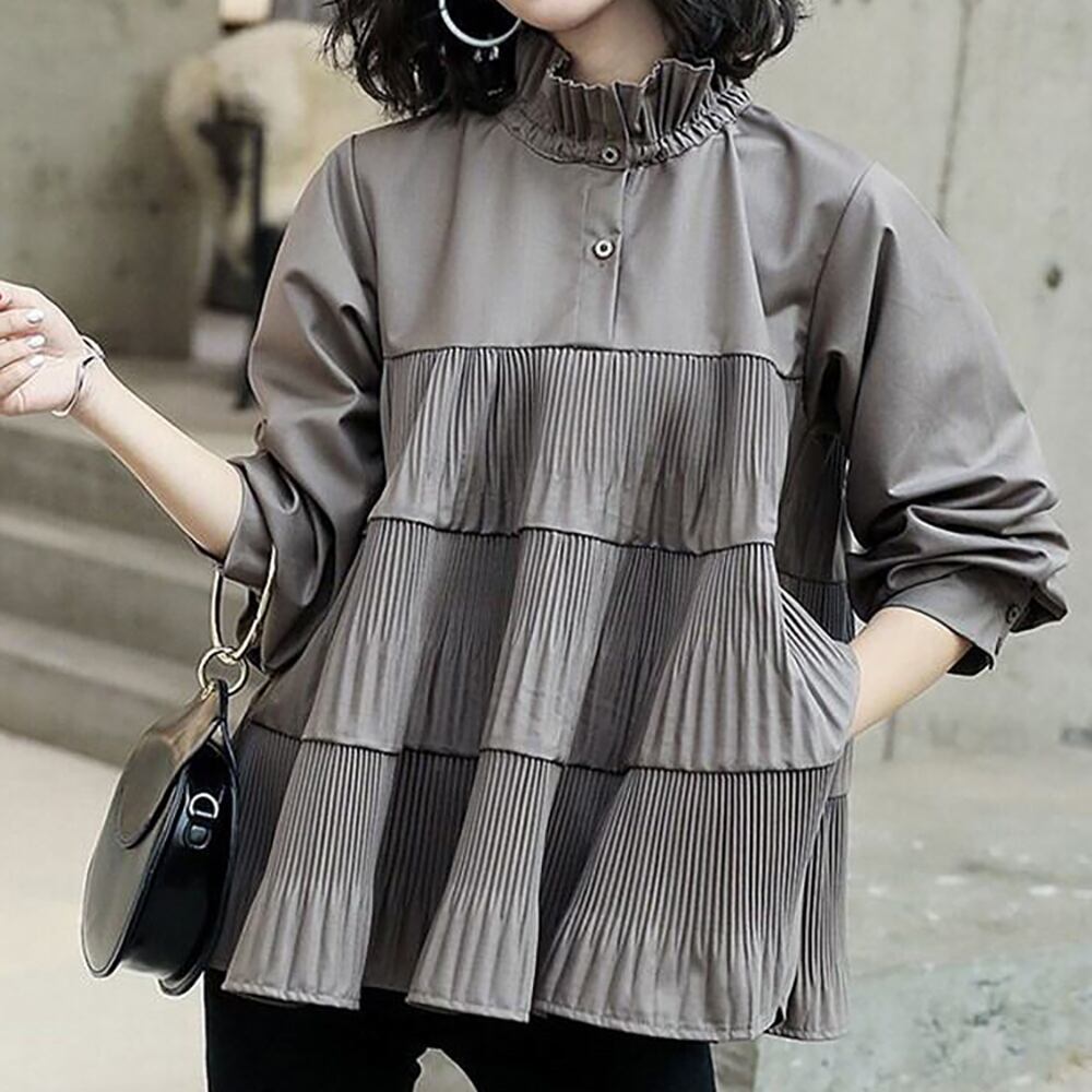 レディースブラウス 長袖 スタンドカラー ハイネック Aライン フレア 無地 切り替えデザイン バックリボン プリーツ加工 シャツ プルオーバー トップス 春 秋 大人可愛い 大人女子 おしゃれ お洒落 ガーリーコーデ カジュアルコーデ シンプルコーデ フェミニン 個性的 モード系 主役級 存在感 通学 学生 大学生 キャンパスコーデ お出かけ デートコーデ 女子会 色違い 着回し お揃い 双子コーデ インスタ映え カラー グレー ダークブラウン サイズ展開 S 7414