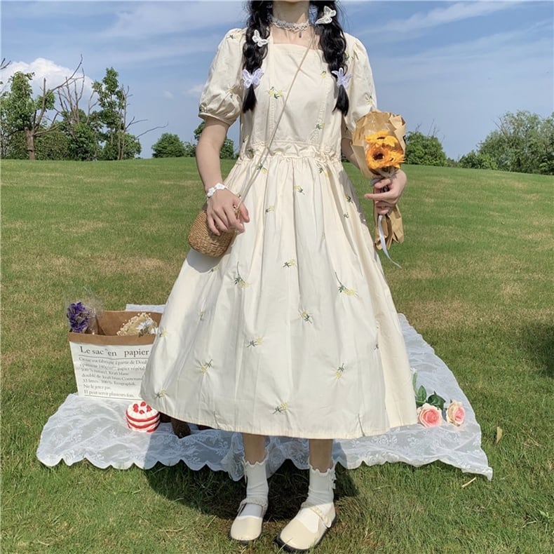 デイジー刺?ワンピース ワンピース フレアワンピース ミモレ ミモレ丈 袖あり 半袖 パフスリーブ スクエアネック フレア Aライン 刺繍 綿 ポリエステル かわいい 大人可愛い きれいめ シンプル カジュアル 大人 おしゃれ お洒落 レトロ 大人可愛い 大人女子 ラブリー キュート ガーリー 主役級 存在感 無地 フラワー 春 夏 10代 20代 30代 レディース 学生 通学 デート お出かけ 公園デビュー 女子会 休日 着回し 普段使い 韓国 韓国系 サイズ S M L 色展開 7512
