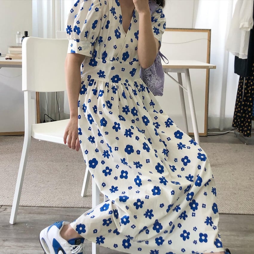 花柄ロングワンピース ワンピース フレアワンピース ロング ロング丈 マキシ マキシ丈 袖あり 半袖 パフスリーブ Vネック フレア ハイウエスト 綿 ポリエステル かわいい 大人可愛い シンプル カジュアル おしゃれ お洒落 レトロ 大人可愛い 大人女子 こなれ感 ラブリー キュート ガーリー 個性的 主役級 存在感 柄 花柄 フラワー 春 夏 10代 20代 30代 レディース 学生 通学 デート お出かけ 公園デビュー 女子会 休日 着回し 普段使い 韓国 韓国系 色展開 白 ホワ 7523