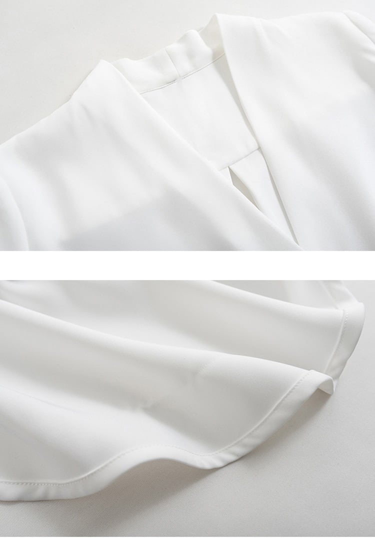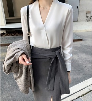 サテンシャツ トップス ブラウス 白シャツ 長袖 Vネック 薄手 無地 ビジネス OL 通勤 デート S M L XL 2 4851