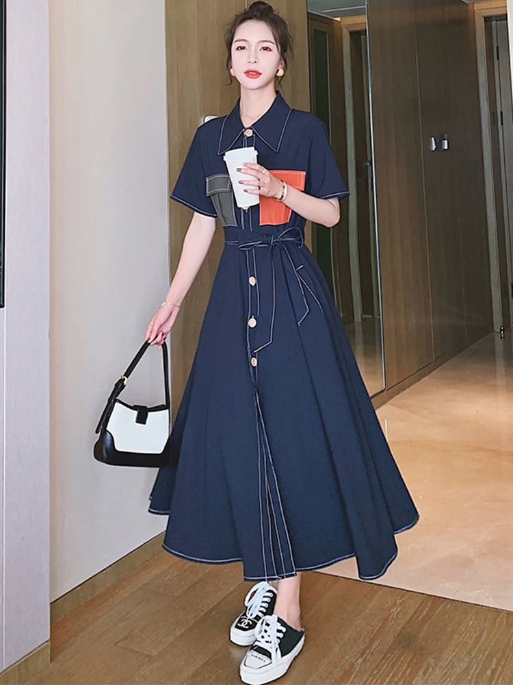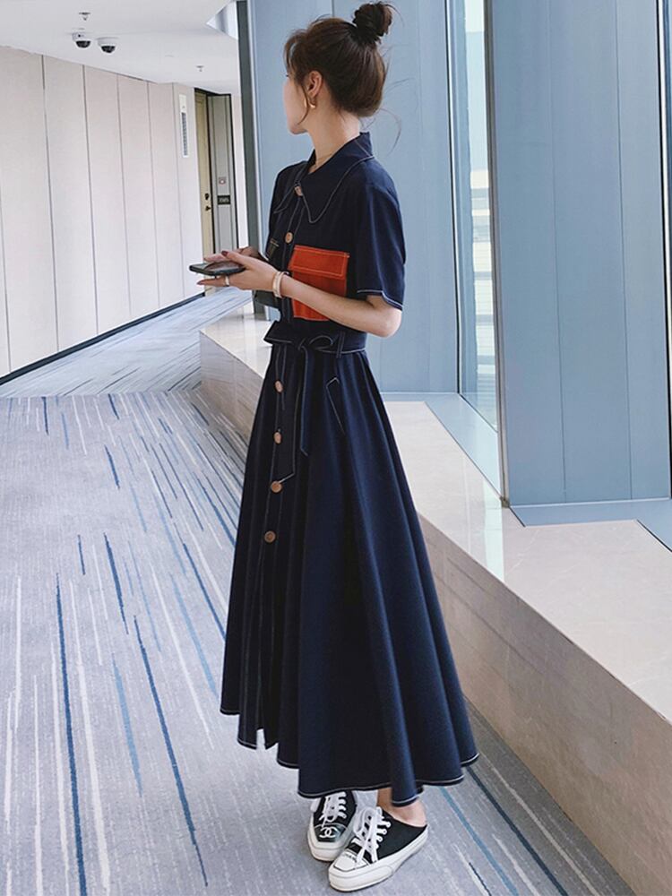 ステッチシャツワンピース ワンピース シャツワンピース ロング ロング丈 袖あり 半袖 襟付き フレア Aライン ウエストマーク ウエストリボン 前開き かわいい 大人可愛い きれいめ シンプル カジュアル おしゃれ お洒落 レトロ 大人可愛い 大人女子 こなれ感 ラフ ラブリー キュート ガーリー 個性的 主役級 存在感 無地 春 秋 10代 20代 30代 レディース 学生 通学 デート お出かけ 女子会 休日 着回し 普段使い 重ね着 韓国 韓国系 サイズ S M L XL 色 7535