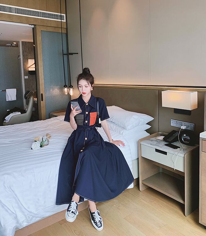 胸元のポケットが個性的で可愛いロング丈ステッチシャツワンピース。