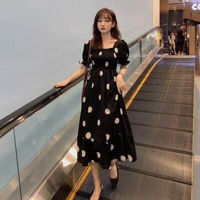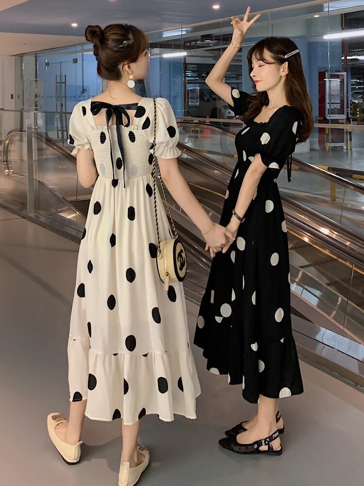 バックリボンドット柄ワンピース ワンピース フレアワンピース ロング ロング丈 袖あり 半袖 パフスリーブ スクエアネック フレア Aライン 切り替えデザイン リボン バックリボン ポリエステル かわいい 大人可愛い シンプル 大人 上品 おしゃれ お洒落 レトロ 大人可愛い 大人女子 こなれ感 ラブリー キュート ガーリー 個性的 主役級 存在感 柄 ドット柄 水玉 春 夏 10代 20代 30代 レディース 学生 通学 デート お出かけ 女子会 休日 着回し M L XL 2XL 3X 7539
