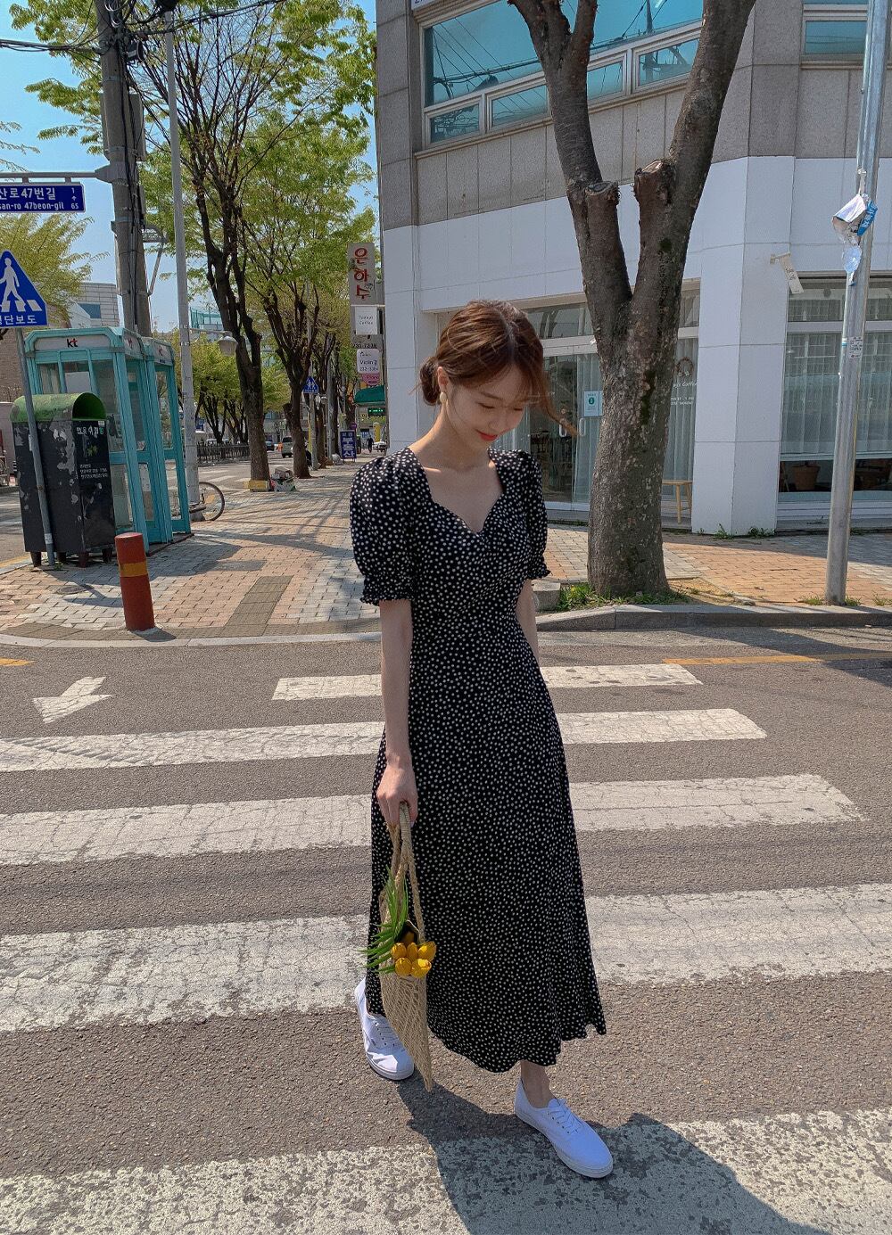 パフスリーブロングワンピース ワンピース フレアワンピース ロング ロング丈 袖あり 半袖 パフスリーブ Vネック 麻 リネン かわいい 大人可愛い きれいめ シンプル 大人 上品 おしゃれ お洒落 レトロ 大人可愛い 大人女子 こなれ感 ラブリー キュート ガーリー 個性的 主役級 存在感 柄 ドット柄 水玉 春 夏 10代 20代 30代 レディース 学生 通学 デート お出かけ 女子会 休日 普段使い 重ね着 韓国 韓国系 サイズ S M L XL 7541