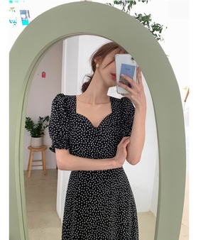 女性らしさを際立たせる美しいシルエットと、心惹かれるドット柄が魅力のワンピース。