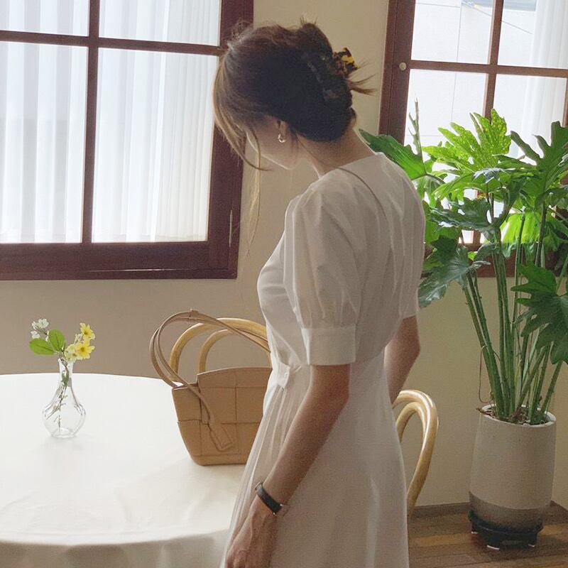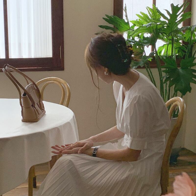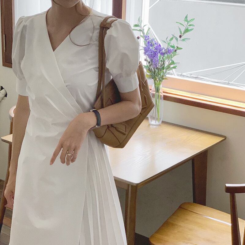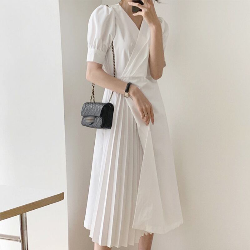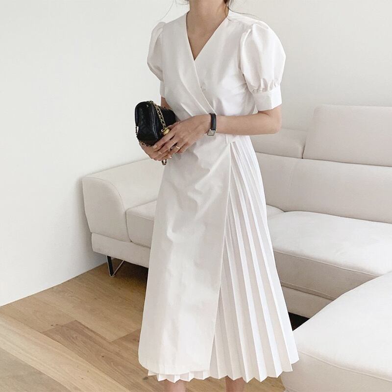 切り替えプリーツワンピース ワンピース フレアワンピース ロング ロング丈 袖あり 半袖 パフスリーブ Vネック プリーツ 綿 かわいい 大人可愛い きれいめ シンプル カジュアル 大人 おしゃれ お洒落 大人可愛い 大人女子 こなれ感 ラブリー キュート ガーリー 個性的 主役級 無地 春 夏 10代 20代 30代 レディース 学生 通学 デート お出かけ 女子会 休日 着回し 普段使い お揃い 韓国 韓国系 色展開 7562