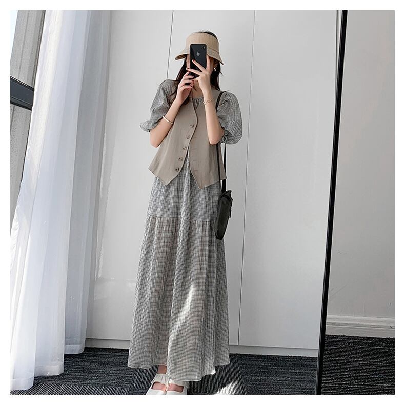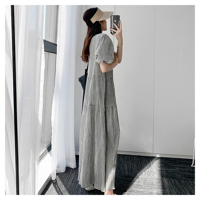 チェック柄半袖ワンピース ワンピース フレアワンピース ロング ロング丈 マキシ マキシ丈 袖あり 半袖 パフスリーブ ラウンドネック フレア マーメイド 綿 麻 リネン かわいい 大人可愛い きれいめ シンプル カジュアル 大人 おしゃれ お洒落 大人可愛い 大人女子 こなれ感 ラブリー キュート ガーリー 個性的 クール 主役級 存在感 柄 チェック柄 0 春 夏 10代 20代 30代 レディース OL 学生 通学 デート お出かけ 女子会 休日 普段使い 韓国 韓国系 サイズ S 7590