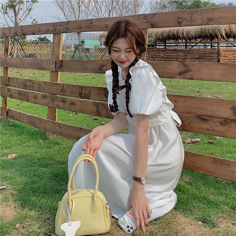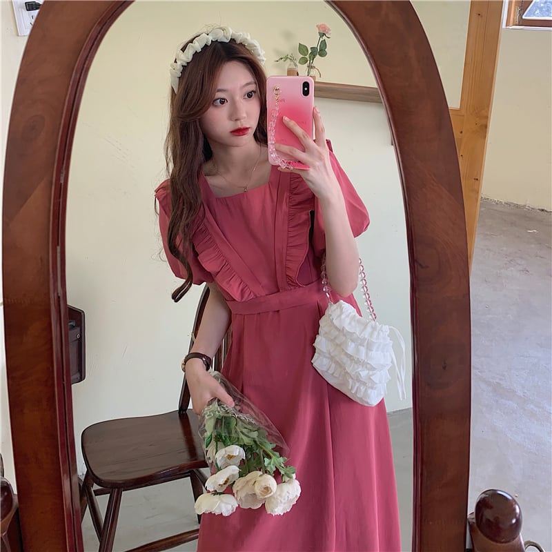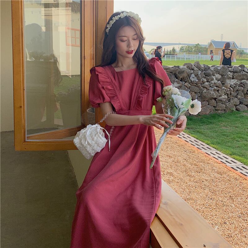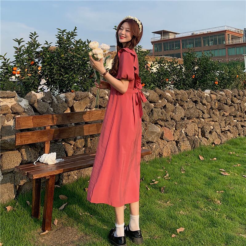 フリルワンピース ワンピース フレアワンピース ワンピドレス ロング ロング丈 袖あり 半袖 パフスリーブ ラウンドネック フレア フリル リボン かわいい 大人可愛い シンプル カジュアル 大人 おしゃれ お洒落 レトロ 大人可愛い 大人女子 こなれ感 ラフ ラブリー キュート ガーリー 個性的 主役級 存在感 無地 0 春 夏 10代 20代 30代 レディース 学生 通学 デート お出かけ 女子会 休日 着回し 普段使い 重ね着 韓国 韓国系 サイズ L XL 2XL 3XL 4XL 7603