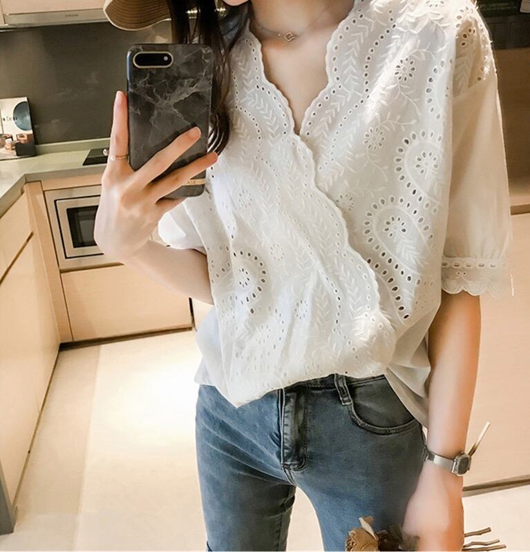 トップス シャツ ブラウス 白ブラウス Vネック カシュクール 半袖 袖あり パンチングレース 花柄 刺? レース スカラップ ドロップショルダー アシメ アシンメトリー 薄手 薄い ゆったり ルーズ シンプル 大人 きれいめ カジュアル 大人可愛い かわいい 可愛い 大人女子 おしゃれ お洒落 通勤 OL オフィス お出かけ デート 旅行 休日 普段着 普段使い 着回し レディース 10代 20代 30代 夏 M L XL 2XL 3XL 4XL 7511