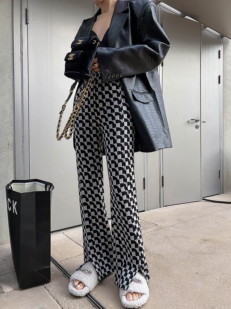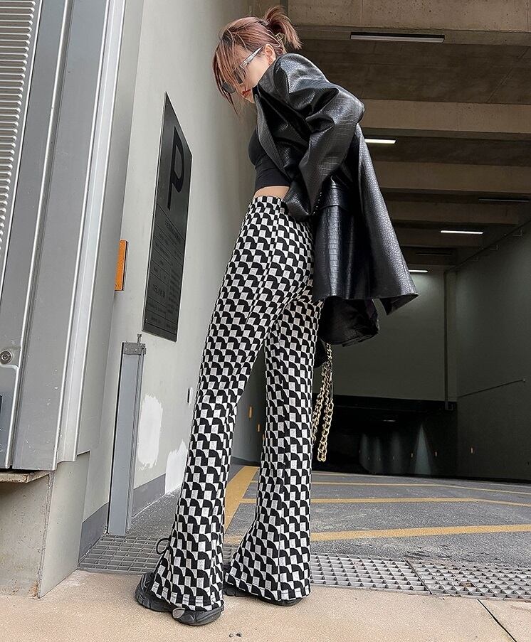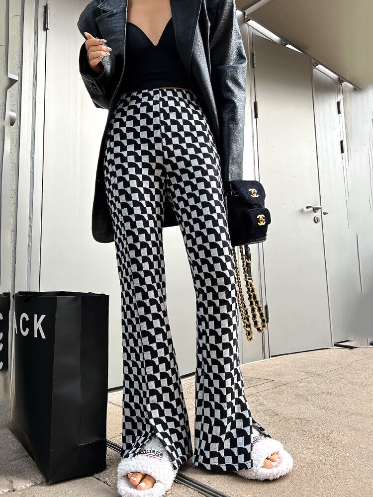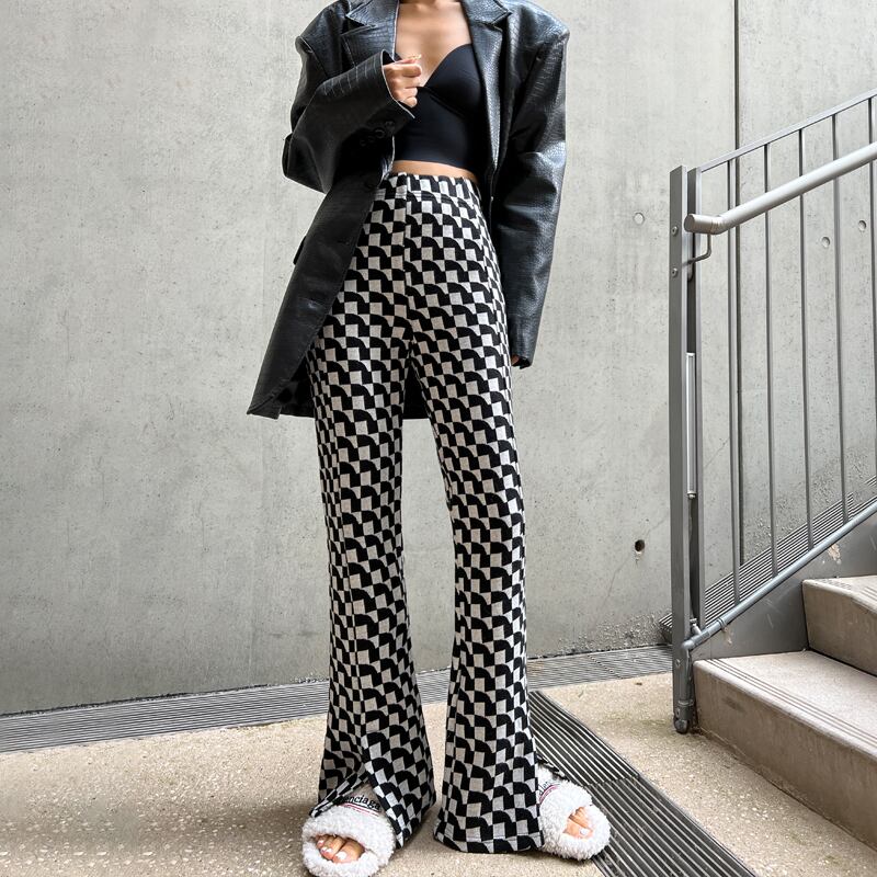 ボトムス フレアパンツ ニットパンツ パンツ ズボン ロング ロング丈 フレア スリット ハイウエスト ウエストゴム 伸縮性 ニット かわいい 大人可愛い きれいめ カジュアル 大人 上品 おしゃれ お洒落 かっこいい 大人女子 こなれ感 ラフ ルーズ 個性的 クール モード系 存在感 柄 チェック柄 春 秋 10代 20代 レディース 通勤 学生 通学 デート お出かけ 女子会 休日 旅行 着回し 普段使い 韓国 韓国系 オルチャン コーデ 美脚 脚長 S M L 7817