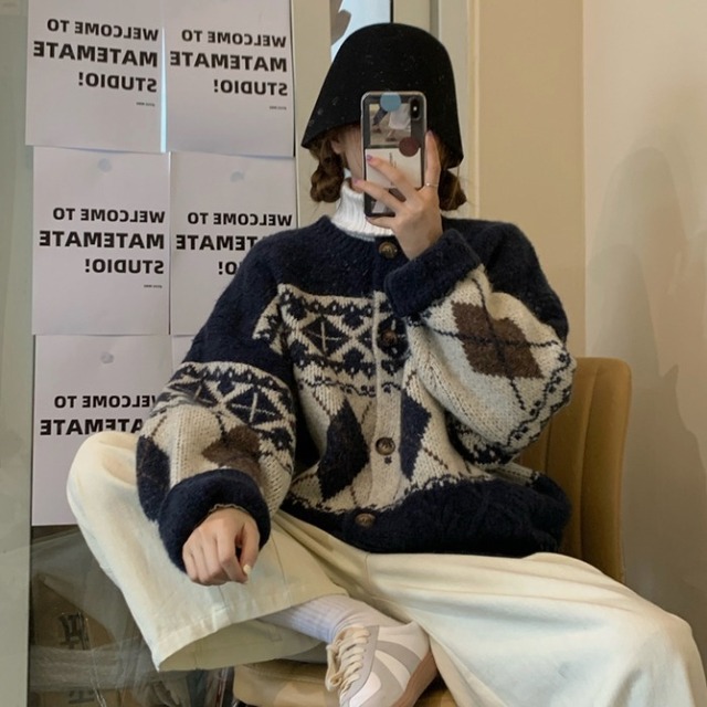 トップス ニット カーディガン ショート ショート丈 袖あり 長袖 ドロップショルダー ラウンドネック 襟なし 前開き 厚手 かわいい 大人可愛い カジュアル 大人 おしゃれ お洒落 大人女子 ルーズ 個性的 柄 春 秋 冬 10代 20代 レディース 通勤 学生 通学 デート お出かけ 女子会 休日 旅行 着回し 普段使い 重ね着 韓国 韓国系 オルチャン 暖かい 防寒 ゆったり ゆる フリーサイズ 色展開 ネイビー 7848