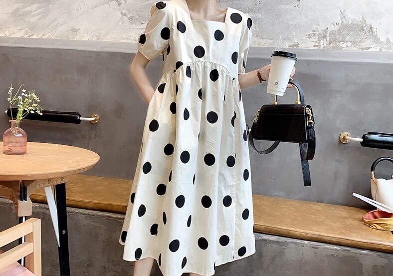ドット柄 ワンピース フレアワンピース 膝下 ミモレ ミモレ丈 袖あり 半袖 パフスリーブ スクエアネック 襟なし フレア リボン ウエストマーク ウエストリボン 切り替えデザイン ハイウエスト 綿 かわいい 大人可愛い シンプル カジュアル 大人 おしゃれ お洒落 レトロ 大人女子 ガーリー ルーズ 主役級 柄 水玉 夏 10代 20代 レディース 通勤 学生 通学 デート お出かけ 女子会 休日 旅行 普段使い 重ね着 韓国 楽ちん ゆったり サイズ S M L XL 白 ホワ 7714