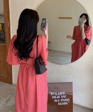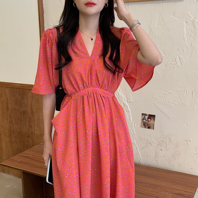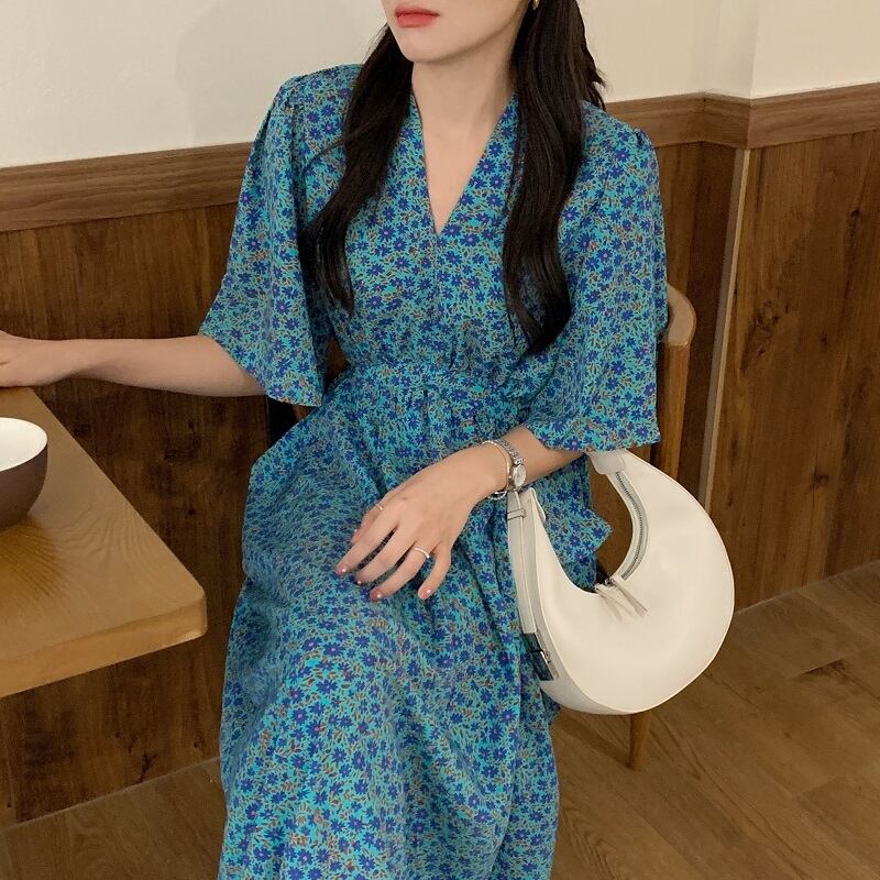 Vネック ワンピース フレアワンピース 膝下 ミモレ ミモレ丈 袖あり 半袖 5分袖 五分袖 フレアスリーブ 襟なし フレア ウエストリボン バックリボン ポケット ハイウエスト ポリエステル かわいい 大人可愛い カジュアル 大人 おしゃれ お洒落 大人女子 個性的 主役級 存在感 柄 花柄 小花柄 フラワー 春 夏 10代 20代 レディース 通勤 学生 通学 デート お出かけ 女子会 休日 旅行 着回し 普段使い 韓国 韓国系 オルチャン ゆったり フリーサイズ 色展開 青 ブルー ピ 7719