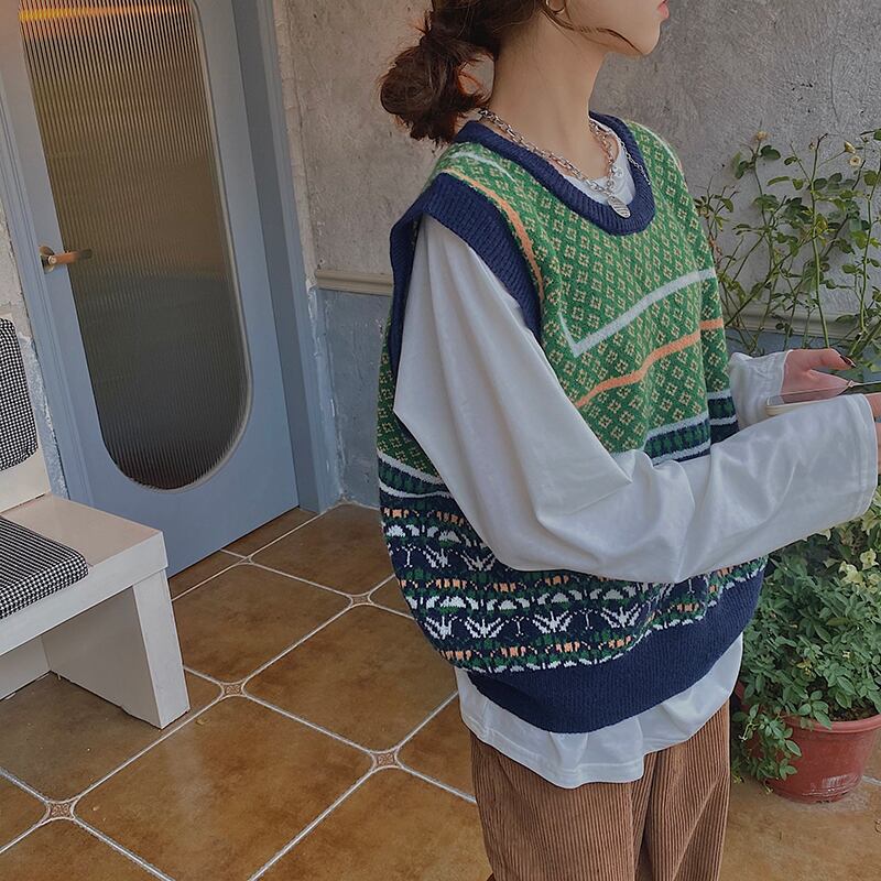 ニットベスト トップス ベスト ショート ショート丈 袖なし ノースリーブ ラウンドネック 襟なし ニット かわいい 大人可愛い シンプル カジュアル 大人 おしゃれ お洒落 大人女子 こなれ感 ルーズ 個性的 主役級 存在感 柄 春 秋 10代 20代 レディース 通勤 学生 通学 デート お出かけ 女子会 休日 旅行 着回し 普段使い 重ね着 韓国 韓国系 オルチャン 暖かい ゆったり ゆる フリーサイズ 色展開 7151
