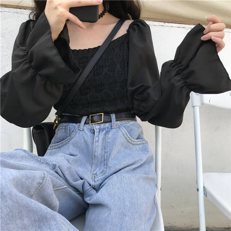異素材MIX ニット シャツ ブラウス トップス プルオーバー ショート ショート丈 袖あり 長袖 フレアスリーブ スクエアネック 襟なし スリム クロシェ 編み込み かわいい 大人可愛い シンプル カジュアル 大人 おしゃれ お洒落 大人女子 ガーリー 個性的 主役級 無地 春 秋 10代 20代 レディース 通勤 学生 通学 デート お出かけ 女子会 休日 旅行 着回し 普段使い 重ね着 韓国 韓国系 オルチャン フリーサイズ 色展開 7228