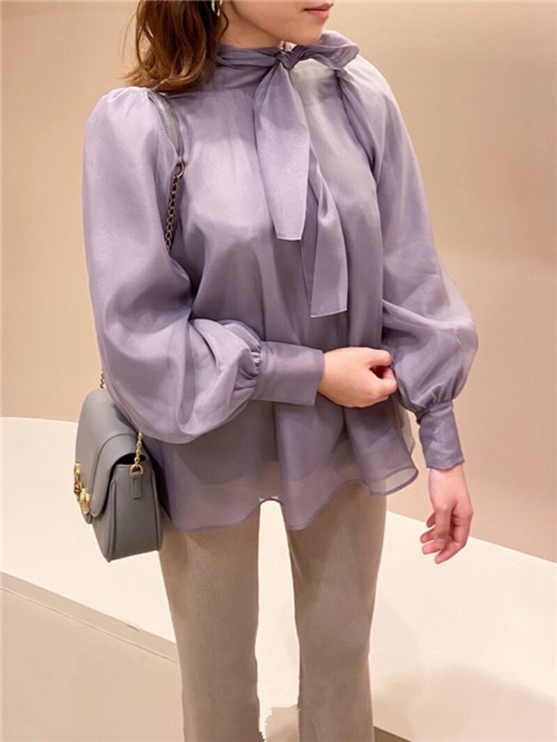 パフスリーブ シフォン ブラウス トップス ショート ショート丈 袖あり 長袖 襟付き ハイネック リボン バックリボン 2way 透け感 シースルー かわいい 大人可愛い きれいめ シンプル カジュアル 大人 おしゃれ お洒落 大人女子 ラブリー キュート ガーリー 無地 ドット柄 水玉 春 秋 10代 20代 レディース 通勤 学生 通学 デート お出かけ 女子会 休日 旅行 着回し 普段使い 重ね着 お揃い 双子 韓国 ゆったり フリーサイズ 色展開 白 ホワイト 紫 パープル 灰色 7239