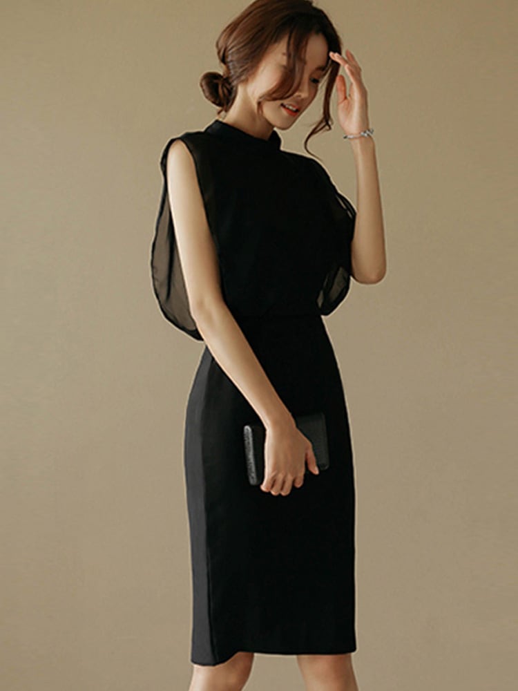 ノースリーブ 膝丈 ワンピース ひざ丈 袖なし 襟付き ハイネック スリム タイト 細身 シフォン バックシャン バックコンシャス ハイウエスト 透け感 シースルー かわいい 大人可愛い きれいめ シンプル 大人 上品 おしゃれ お洒落 大人女子 セクシー エレガント フォーマル 無地 春 夏 秋 二次会 20代 30代 40代 50代 レディース ビジネス OL 通勤 デート お出かけ 女子会 休日 パーティー イベント 普段使い サイズ S M L XL 色展開 7252