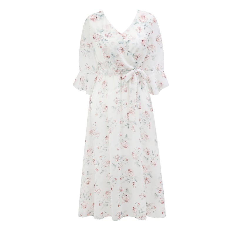 花柄 シフォン ワンピース 膝下 ミモレ ミモレ丈 袖あり 半袖 5分袖 五分袖 フレアスリーブ Vネック 襟なし フレア Aライン フリル リボン ハイウエスト かわいい 大人可愛い シンプル カジュアル 大人 おしゃれ お洒落 大人女子 主役級 小花柄 フラワー 春 夏 10代 20代 レディース 通勤 学生 通学 デート お出かけ 女子会 休日 旅行 着回し 普段使い 重ね着 韓国 韓国系 オルチャン ゆったり サイズ S M L XL 色展開 白 ホワイト 7491