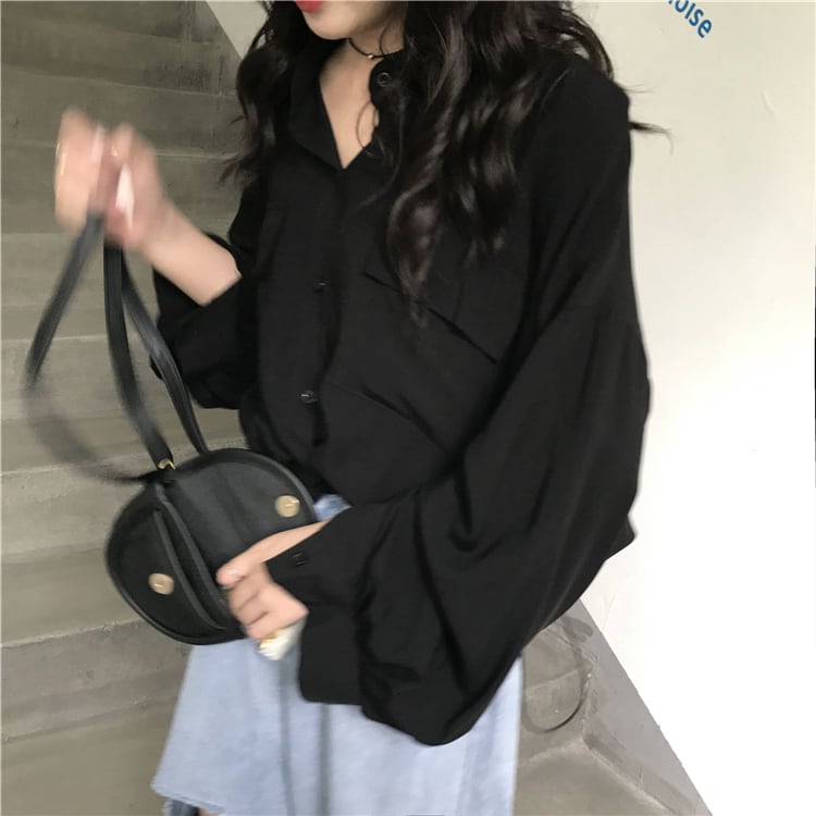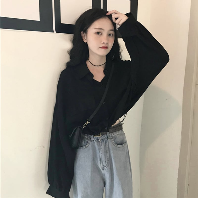 ショート丈 長袖 シャツ トップス ショート 袖あり ドロップショルダー 萌袖 襟付き ポケット 前開き かわいい 大人可愛い シンプル カジュアル 大人 おしゃれ お洒落 大人女子 こなれ感 ルーズ モード系 無地 春 秋 10代 20代 レディース 通勤 学生 通学 デート お出かけ 女子会 休日 旅行 着回し 普段使い 重ね着 韓国 韓国系 オルチャン ファッション ゆったり ゆる 大きいサイズ XL 2XL 3XL 4XL 黒 ブラック